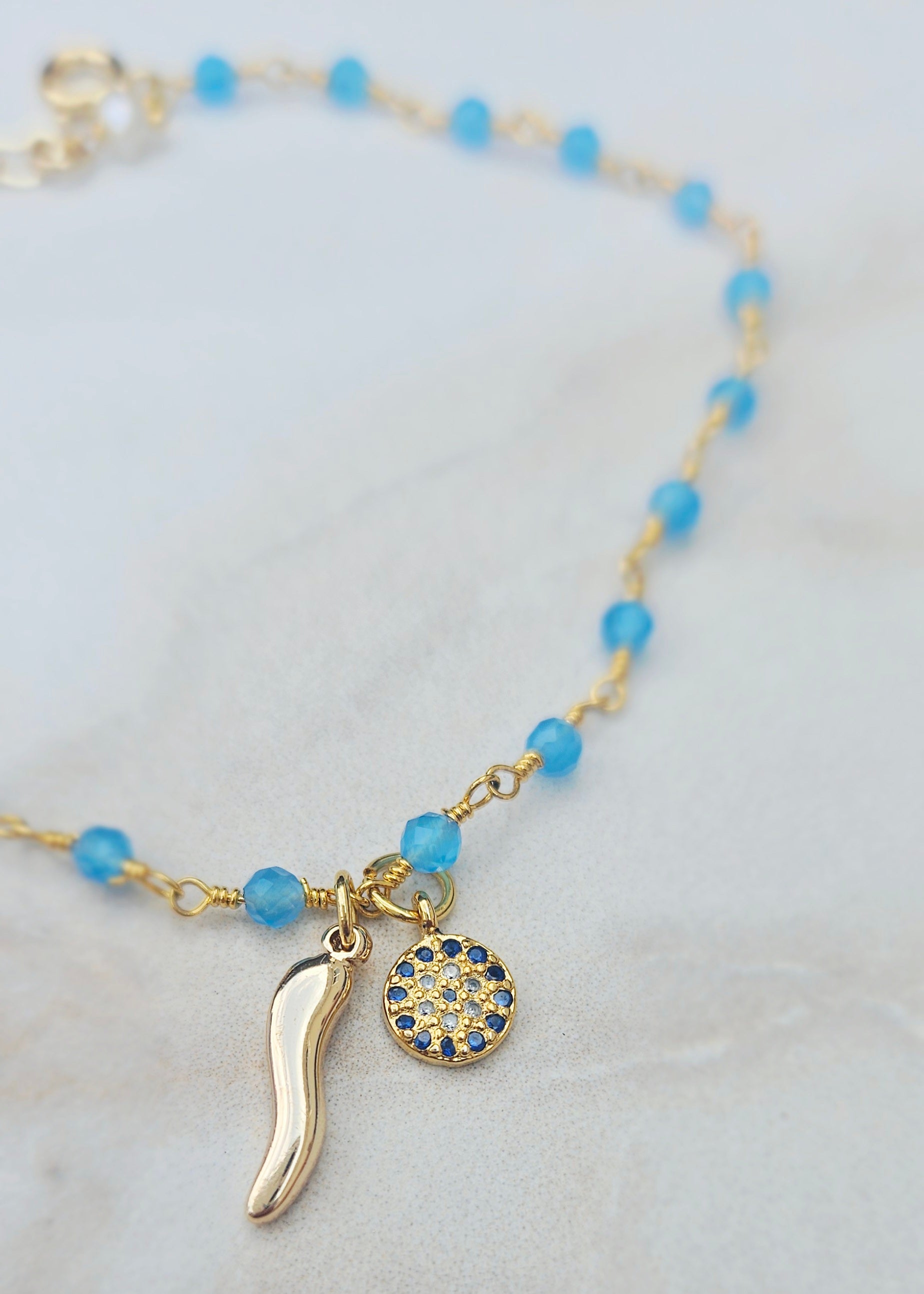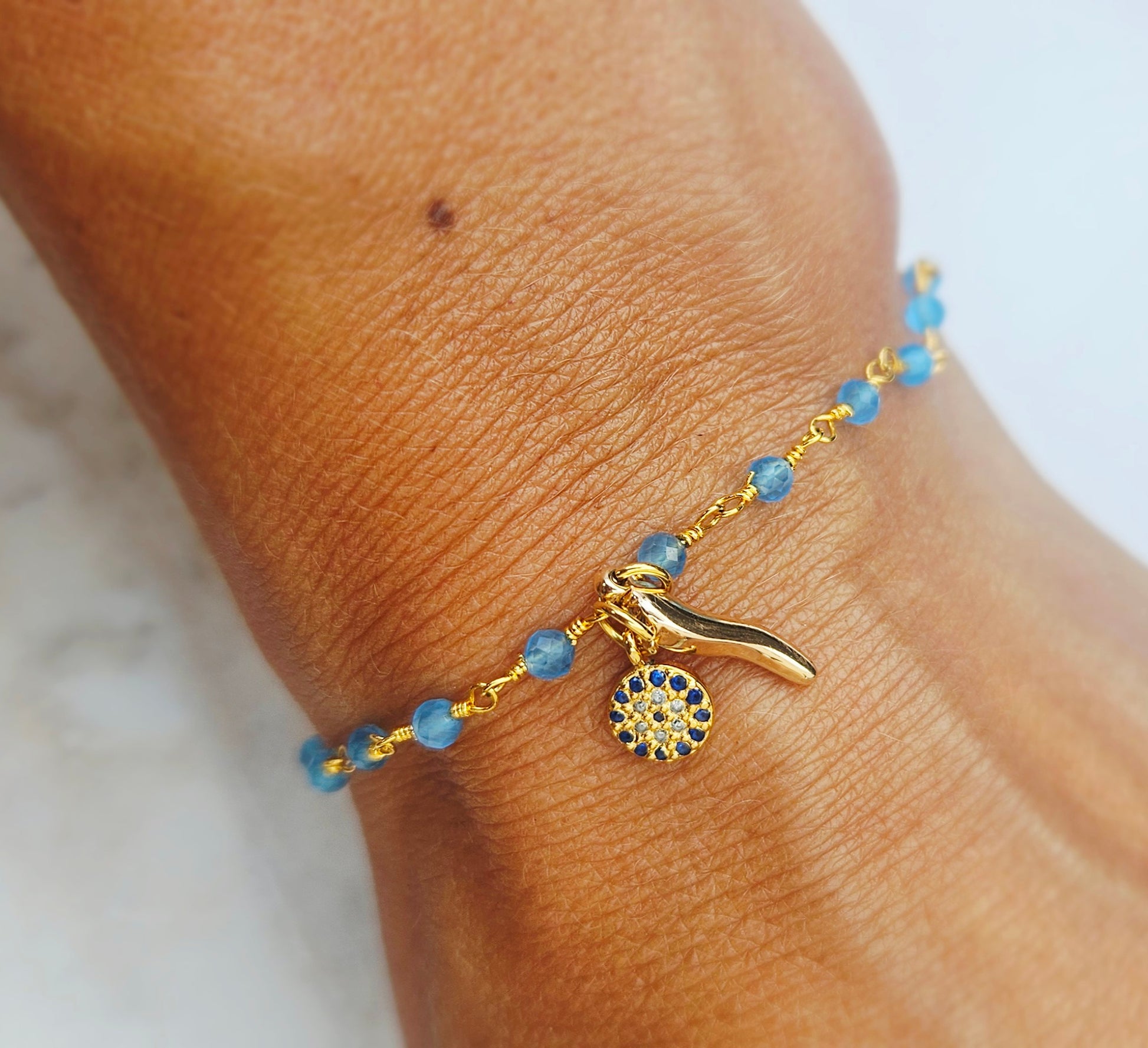 This exquisite rosary bracelet features genuine TANZANITE beads, intricately wired with 22k gold plating. It includes a gold plated eye and Italian cornicello horn, as well as a 6.5 inch bracelet and 1 inch heart extension with Santomarco's signature pearl.